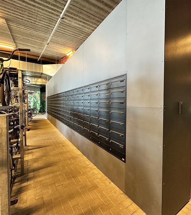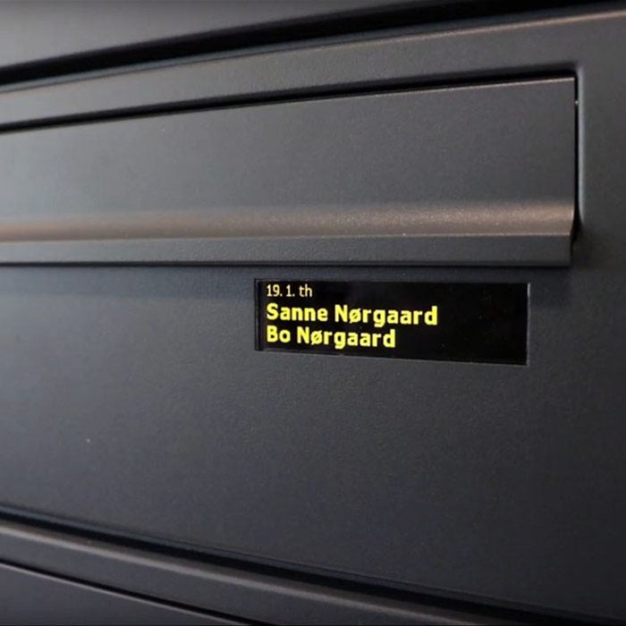 På forsiden af postkasserne er der digitale navne-displays samt elektroniske låse. Hver lejlighed har sin egen postkasse, hvor beboernes navne vises (op til to navne pr. postkasse). Den elektroniske lås åbnes ved, at beboeren scanner sin nøglebrik på læseren ved siden af postkasseanlægget. Postindkastet er naturligvis placeret på forsiden for nem aflevering af post. Ønskes en løsning, hvor beboerne tømmer posten fra bagsiden, kan et EP Digital postkasseanlæg som vinduesfyldning være en mulighed.