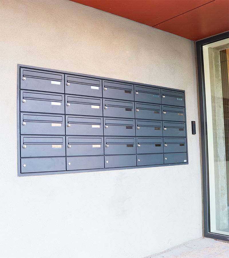 Et planforsænket postkasseanlæg er ideelt til boligejendomme med små opgange, hvor alternative løsninger kan gøre det vanskeligt at overholde bygningsreglementets adgangskrav. Anlægget kan rumme mange individuelle postkasser og sikrer en optimal pladsudnyttelse, når det er integreret i væggen. EP Digital postkasseanlæg fås i fire standardfarver: hvid, sort, antracitgrå og gråaluminium.