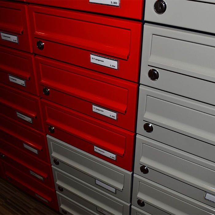Ved hovedindgangene til Hørgårdens afdelinger hænger der vægmonteret EP Custom postkasseanlæg udført i flere varme røde farver. Postkasseanlægget skifter trinvist mellem fire farver som giver et anderledes og smukt udtryk ved indgangen til plejecentret.