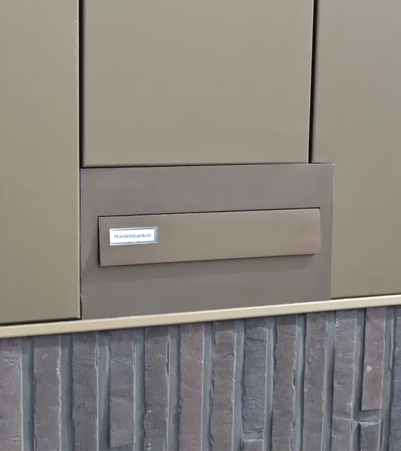 Vores løsninger kan monteres både indendørs og udendørs, og tilpasses arkitektur, antal brugere og ønsket funktionalitet. Postkasserne kan integreres i væggen, monteres på facaden eller placeres som fritstående standere i receptioner, fællesområder eller mellem flere bygninger. Det er muligt at personliggøre postkasserne med gravering, f.eks. med firmanavne.