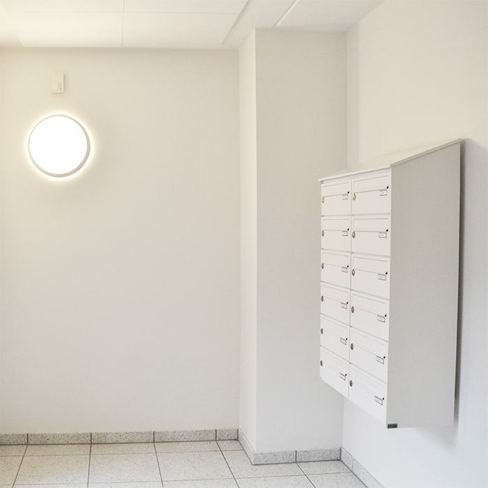 Ved hvert af byggeriets syv rækkehuse står en EP Custom standerpostkasse, som en forlængelse af arkitekturen. Standernes placering og farve binder gård, bygning og indgang arkitektonisk sammen og giver plads til de fine tegldetaljer. I lejlighedsopgangene hænger hvide EP Custom postkasseanlæg som en naturlig del af opgangens hvide miljø. Anlæggenes skrå tage sikrer at der på anlæggets top ikke kan ligge reklamer eller aviser til gene for beboerne.